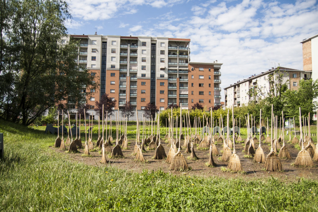 Forêt de balais est une œuvre conçue en 2013 par Michel Blazy, présentée notamment au Domaine de Chaumont-sur-Loire puis à la 57e Biennale de Venise en 2017. Des centaines de balais fabriqués en paille de sorgho, contenant des graines de sorgho, sont plantés directement dans le sol, comme s’ils prenaient racine. Ce geste simple déclenche alors un processus irréversible : livrée au gré de la germination naturelle, l’œuvre évolue et se transforme tout au long de l’exposition. En se développant, les pousses redonnent littéralement vie aux balais et le sorgho redevient un jardin.