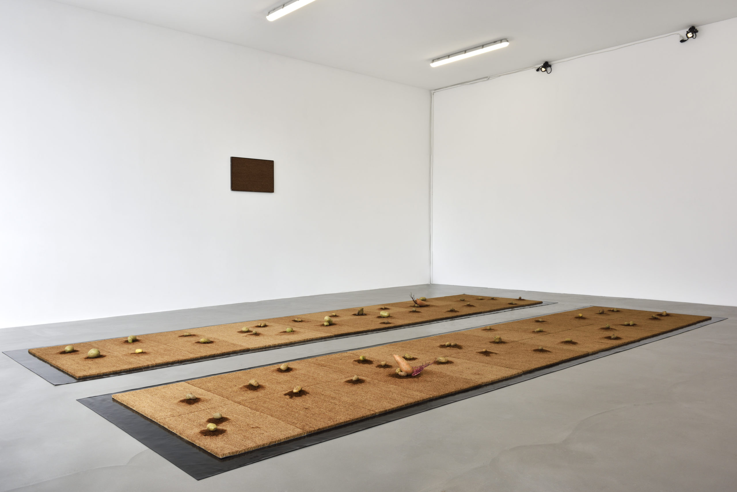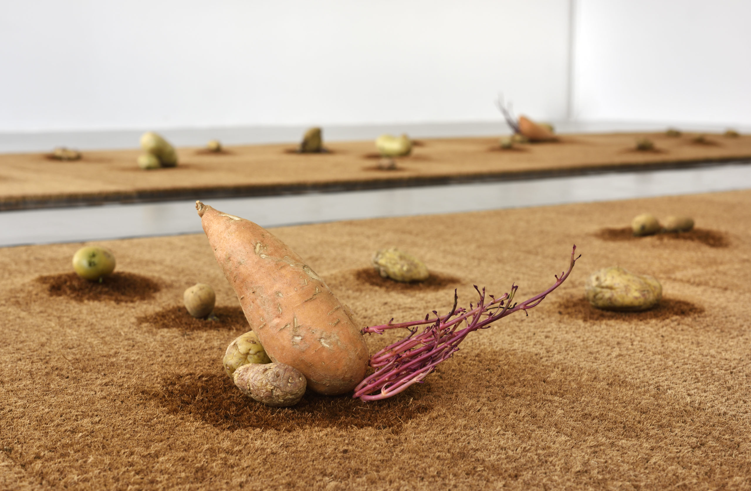 Michel Blazy, Culture de tableaux, 2022. Paillassons, pommes de terre, bâche, eau,